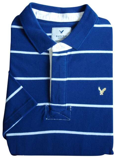 Back Bay horizontal stripe short sleeve polo in a cotton knit with no chest pocket and concealed placket. Featuring a small embroidered eagle logo