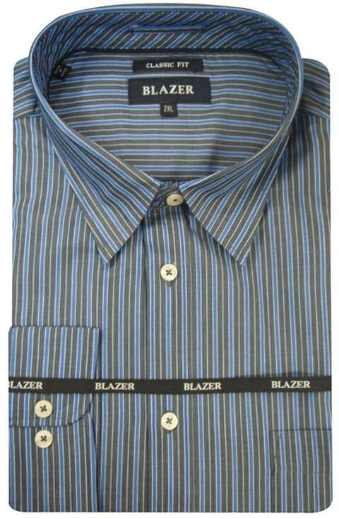 This classic fit Blazer long sleeve shirt in 100% cotton features charcoal and blue vertical stripes, chest pocket and regular cuff.