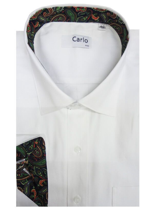 Carlo Primi Paisley Trim long sleeve business shirt. With single chest pocket. Button collar. Paisey pattern on inside collar and cuff. Side pleats on back yoke. Tailored sleeve placquet. Made of 100% Cotton.