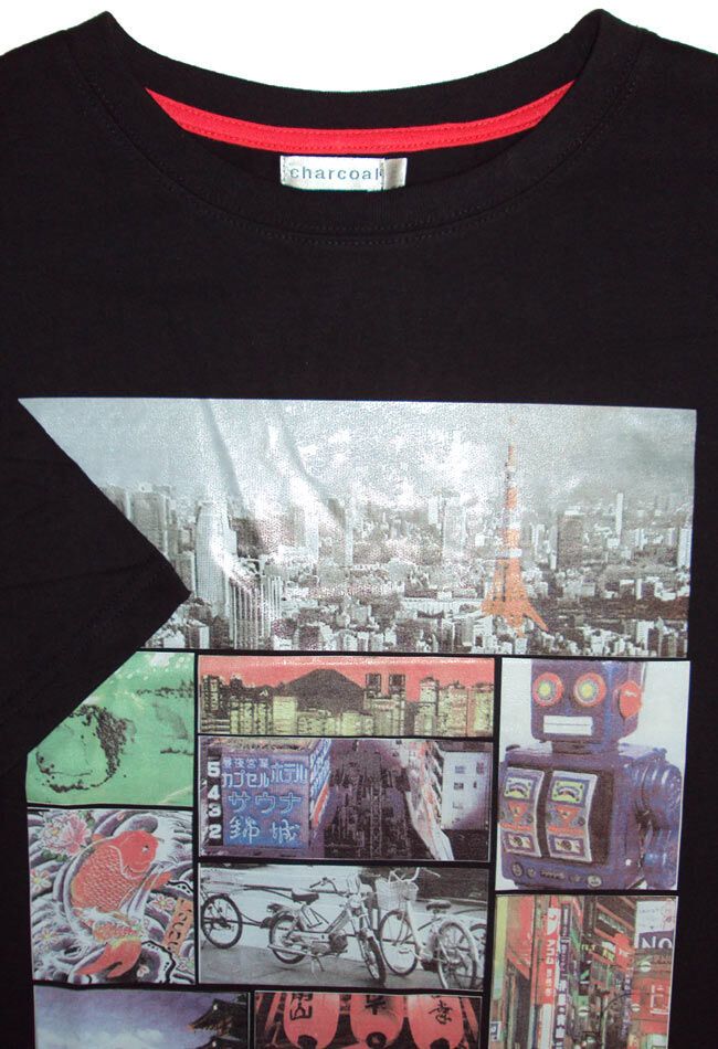 Charcoal Asia short sleeve shirt with large print on chest. Made of 65% cotton, 35% polyester. No pocket.