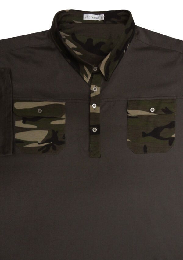 Charcoal Camo short sleeve polo. With double chest pockets. Made of 60% Polyester/ 40% Cotton.