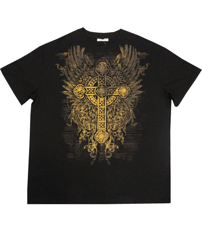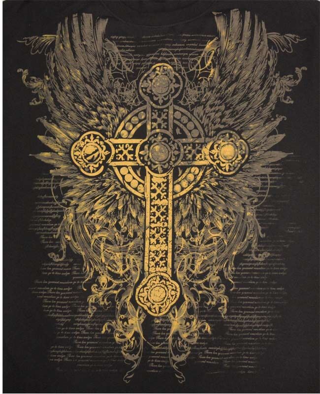 Charcoal t-shirt with a large print of a crucifix on the chest. Made of 65% Cotton and 35% Cotton.