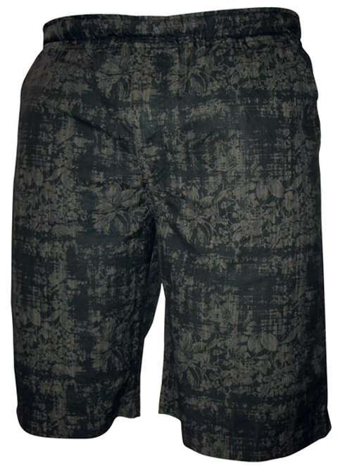 Charcoal board short with urban style hibiscus print. Button up back pocket and a zip fly with elastic waist and drawstring. Available in sizes 107-162