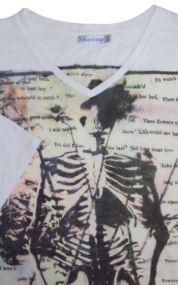 Charcoal short sleeve t-shirt with a large print of a skeleton on an ace of spades card with writing around it. Made of 65% cotton, 35% polyester. No pocket.