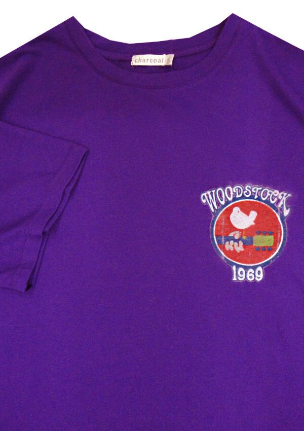 Charcoal Woodstock tshirt with large chest print on back. Made of 40% Cotton/ 60% Polyester.