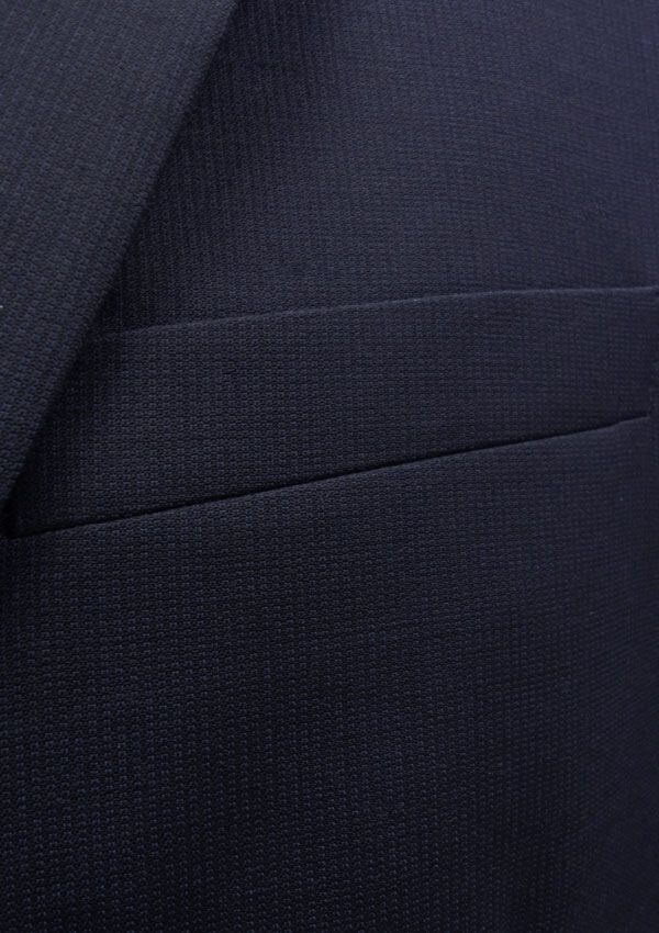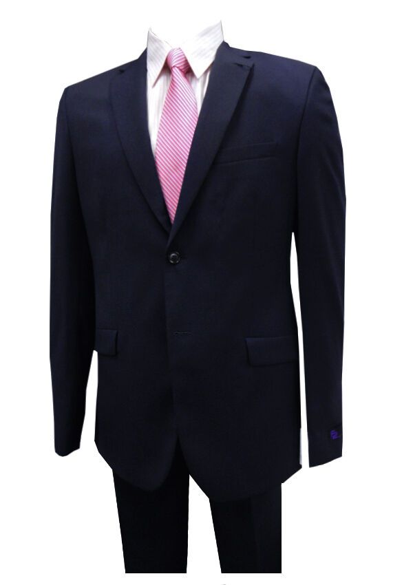 Flair Navy Self Stripe Suit. Trousers include belt loops and zip fly, french bearer, and four pockets. Jacket includes silky interior, two external pockets, and four internal pockets. Made of 60% Wool/ 38% Polyester/ 2% Elastane.