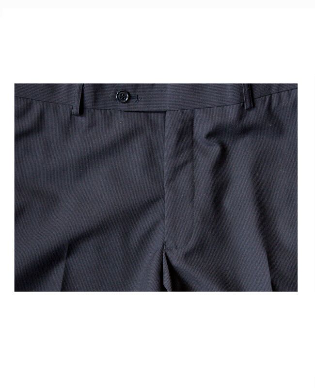 Flair pinstriped tall flat front trouser with french bearer, belt loops, zip fly, hidden pocket in waistband and four pockets. Made of 51% Wool / 49% Polyester. Inside leg measures 38" (97cm)