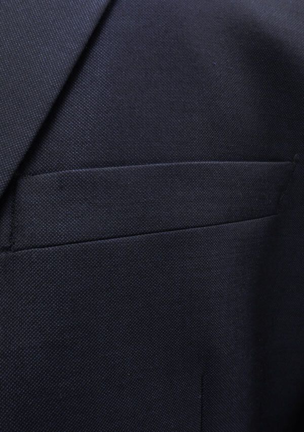 Geoffrey Beene Blue Black Suit. Trousers include belt loops and zip fly, french bearer, four pockets. Jacket includes silky interior, two external pockets, three internal pockets. Made of 85% Wool/ 15% Silk.