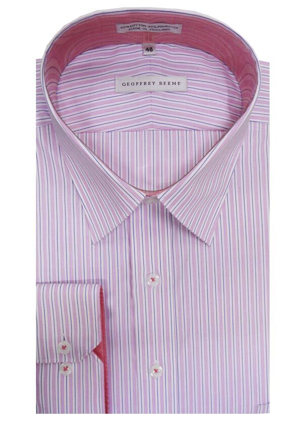 Geoffrey Beene Stripe long sleeve business shirt. With single chest pocket. Button collar. Full sleeve placket. Long back shirt tail. Made of 60% Cotton/ 40% Polyester.