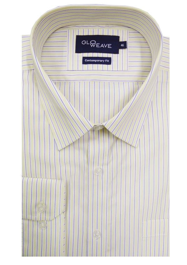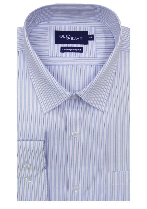 Gloweave Candy stripe long sleeve business shirt with single chest pocket. Button collar. Easy to wash and iron. Contemporary fit. Made of 100% Cotton.