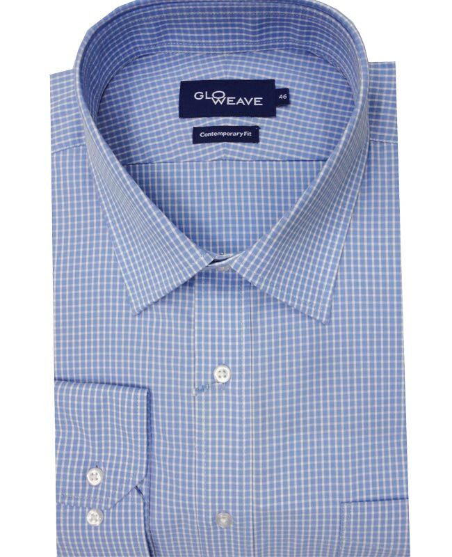 Gloweave contemporary fit, overcheck pattern, long sleeve business shirt with single chest pocket. Cotton/ polyester blend.
