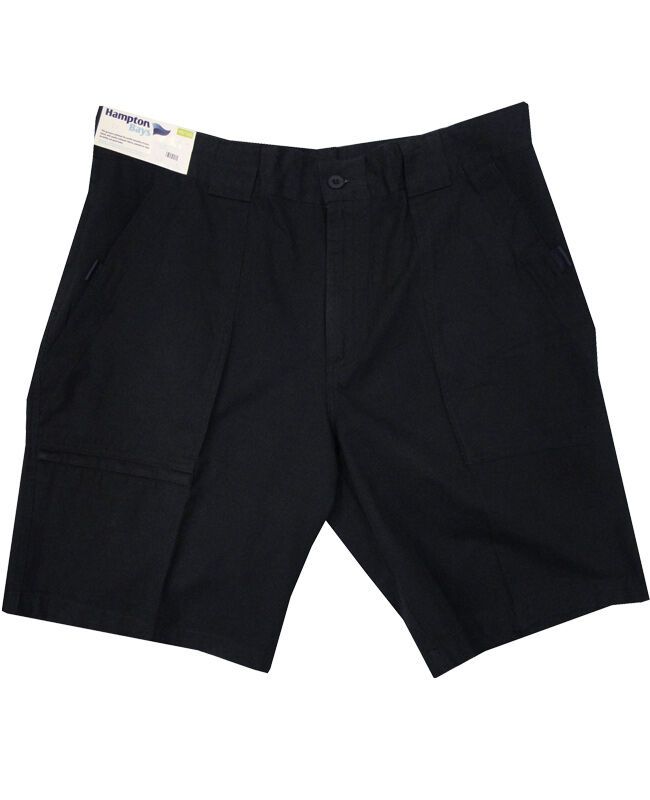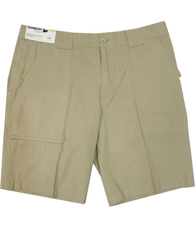 Hampton Bay fitted waist cargo shorts with two slant pockets, two zip pockets, two back velcro pockets and one zipped cargo pocket. Made of 100% Cotton. A dressier version of cargo shorts.