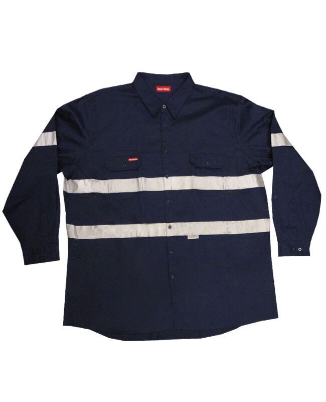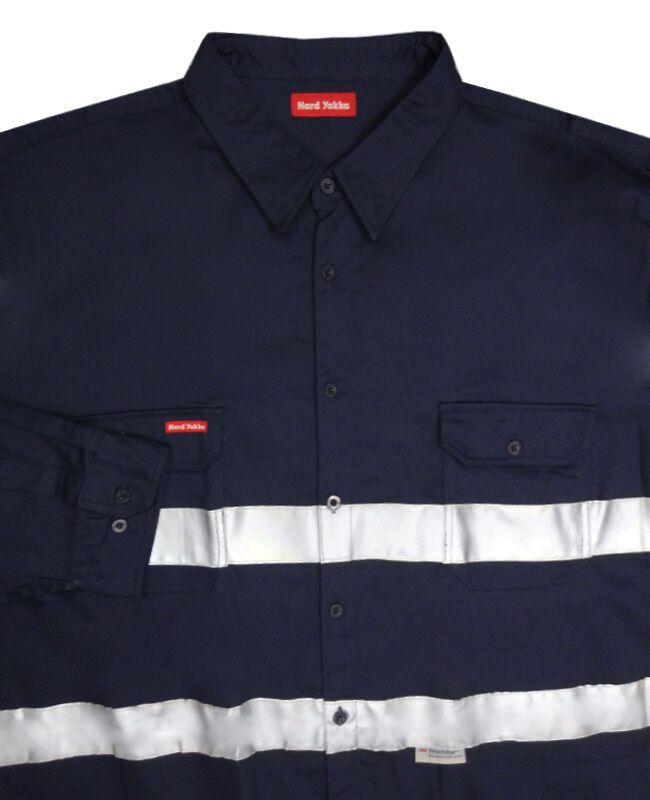 Hard Yakka long sleeve reflective work shirt with two chest pockets. Reflective material around chest. Made from all Cotton.