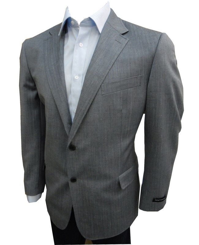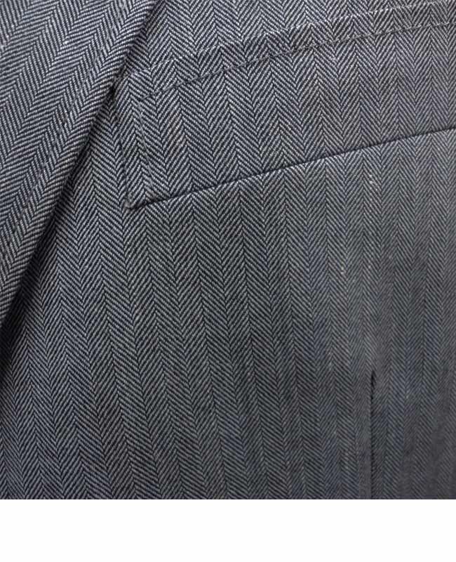 Kent & Lloyd two-button, herringbone sport coat with two exterior pockets and three interior pockets. Made of 60% wool, 35% polyester and 5% linen.