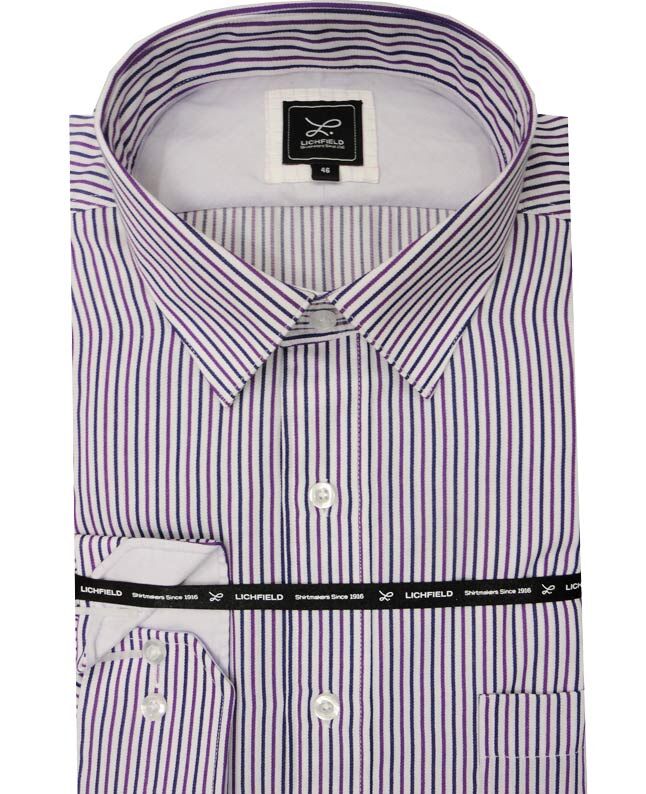 Lichfield extra tall, easy iron, stripe pattern, long sleeved business shirt with single chest pocket. Made of 50% cotton and 50% polyester.