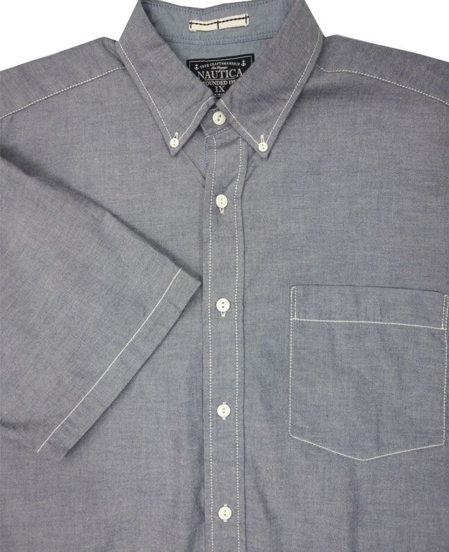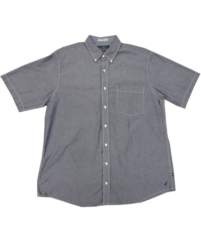 Nautica chambray short sleeve shirt with single chest pocket and button-down collar. Single back pleat. Made of 100% cotton.