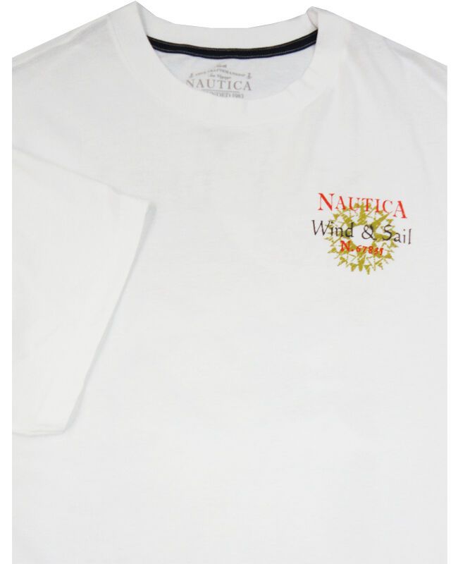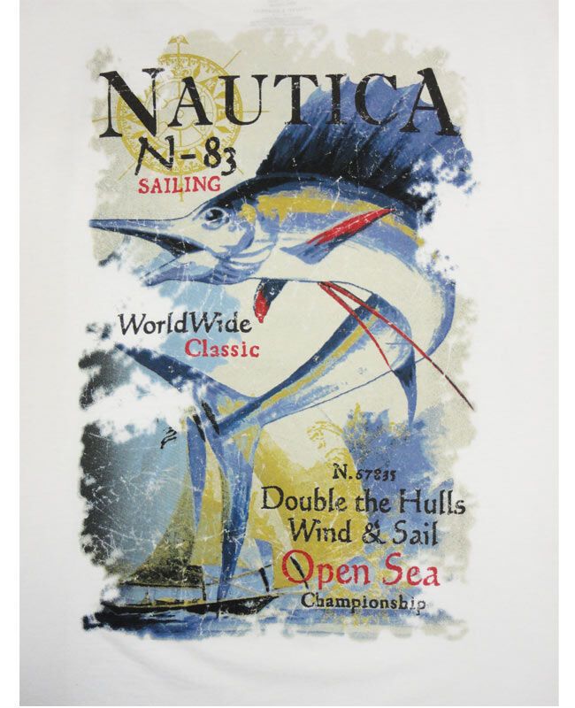 Nautica sailfish short sleeve t-shirt with a small logo print on chest and a very large print on the back. Made of 100% Cotton.