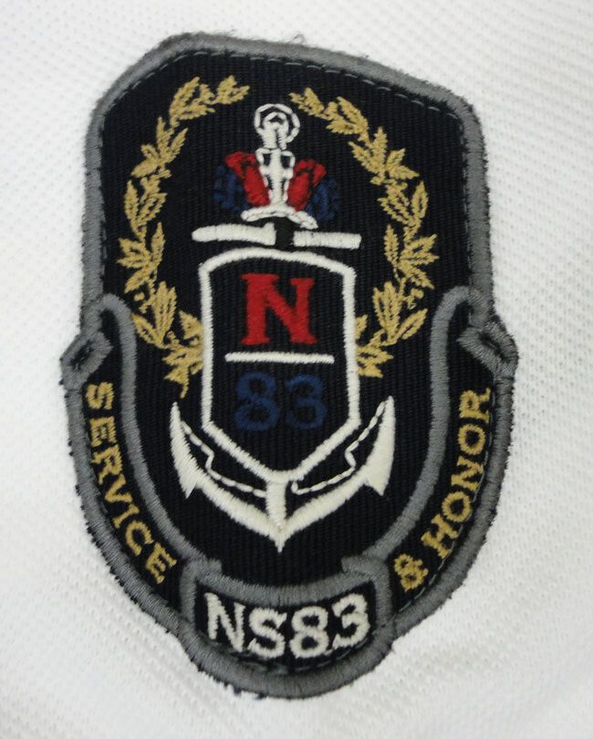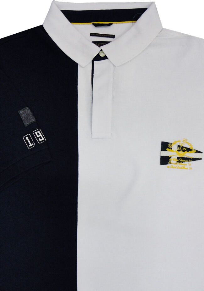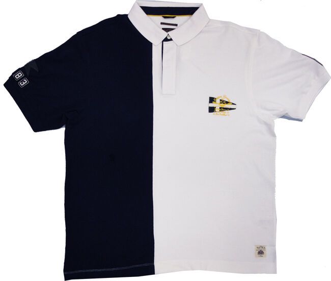 Nautica short sleeve splice rugby polo. One small chest logo, left and right arm logos. Made of 60% Cotton, 40% Polyester.