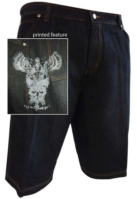 Rising star denim smiley shorts feature a crest print on the outer left leg, two scoop pockets and two deep back pockets.