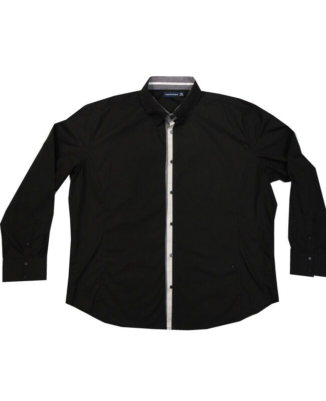 Tarocash black long sleeve shirt with square buttons and striped interior lining on cuff and collar. No pockets. Made of 55% cotton and 45% polyester.